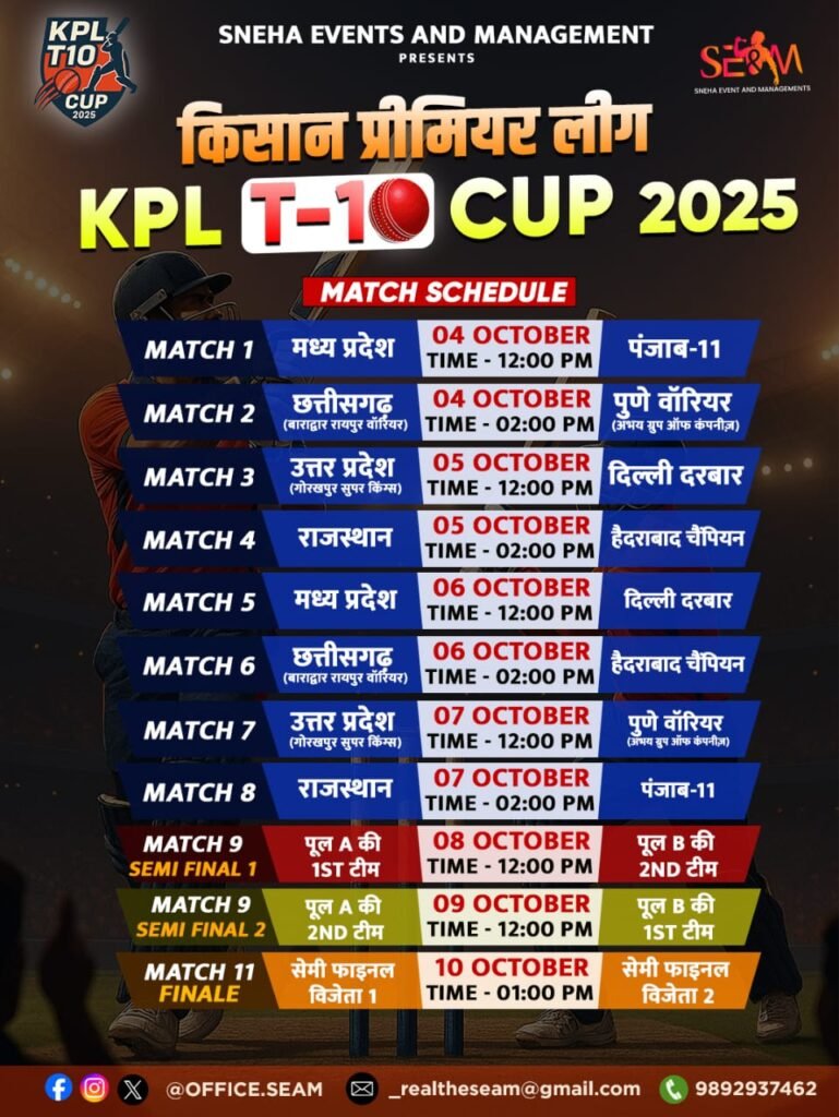 Get ready for 7 days of thrilling T-10 cricket action as the Kisan Premier League T-10 Cup 2025 unfolds from 4th October to 10th October 2025.